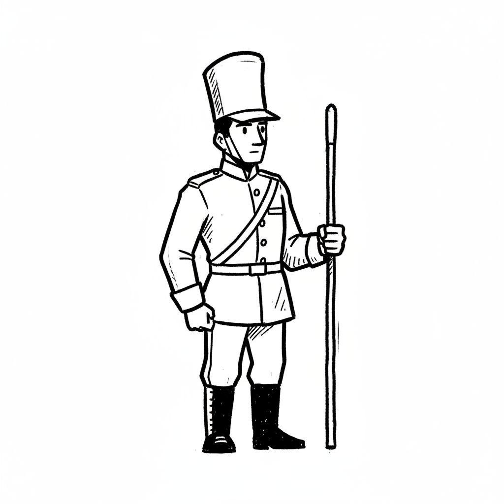 Cartoon eines uniformierten Mannes mit hohem Hut und Stab.
