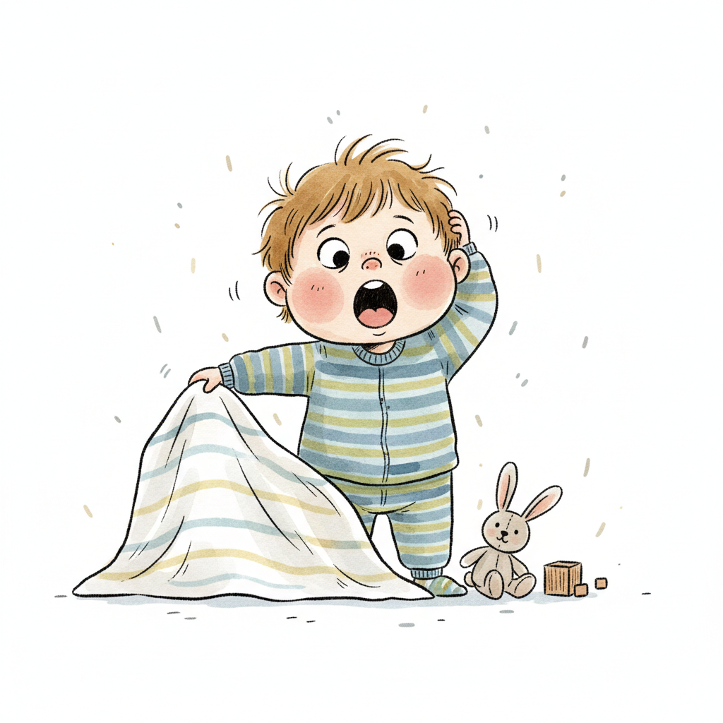 Überraschtes Baby in gestreiftem Schlafanzug hält eine Decke, daneben Spielzeug.