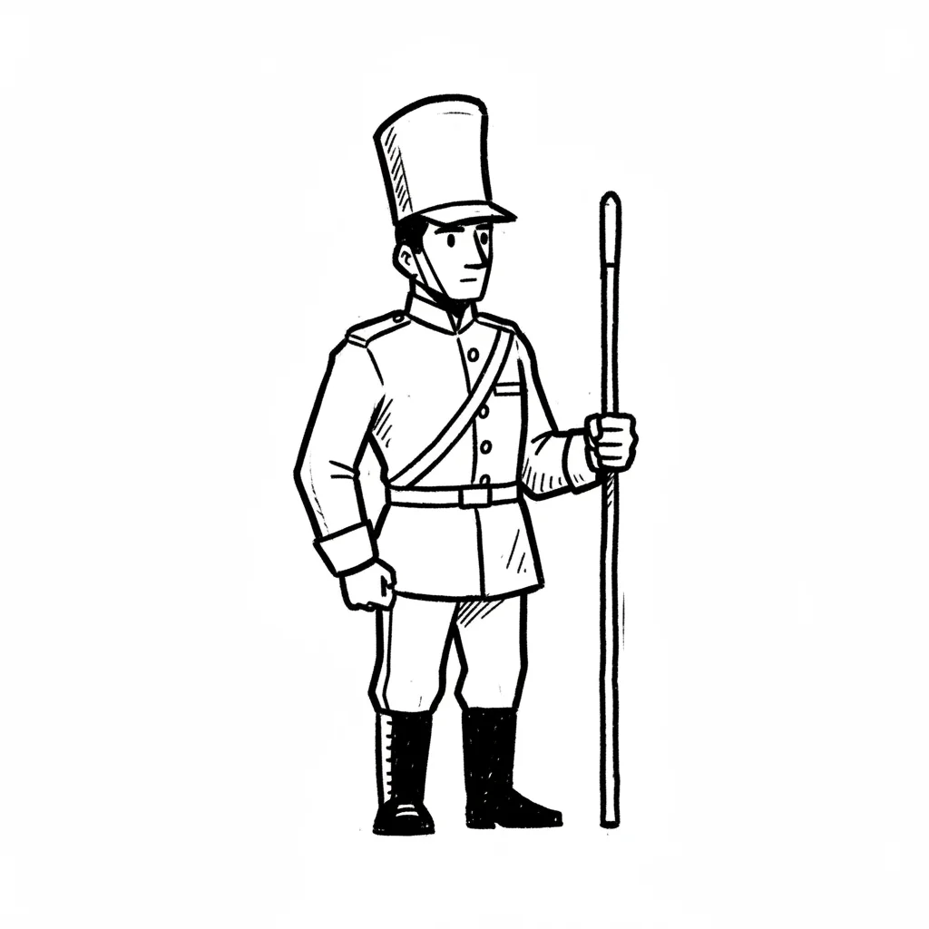 Illustration eines stehenden Soldaten in Uniform mit rotem Helm und Gewehr auf weißem Hintergrund.