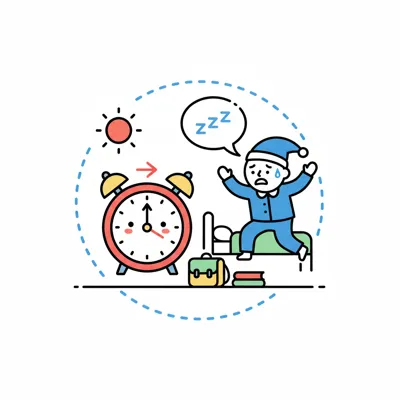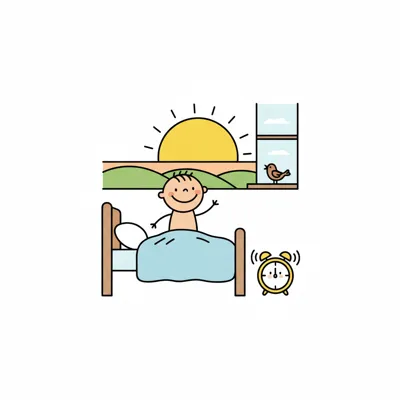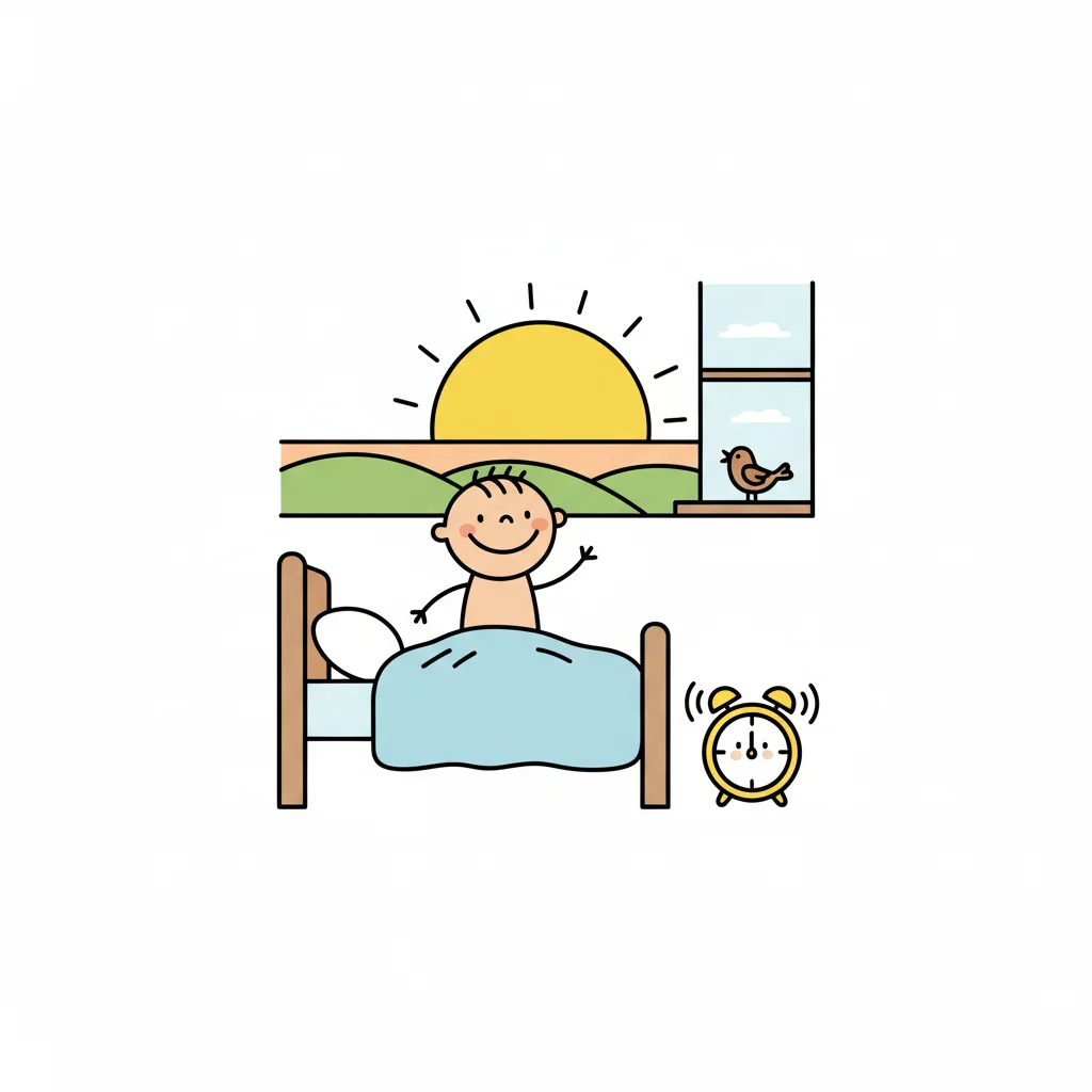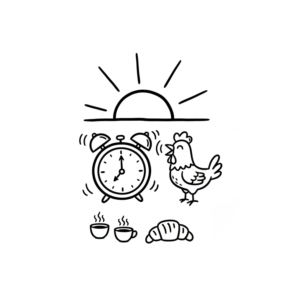 Morgenroutine-Illustration: Sonnenaufgang, Wecker, krähender Hahn, Kaffee und Croissant.