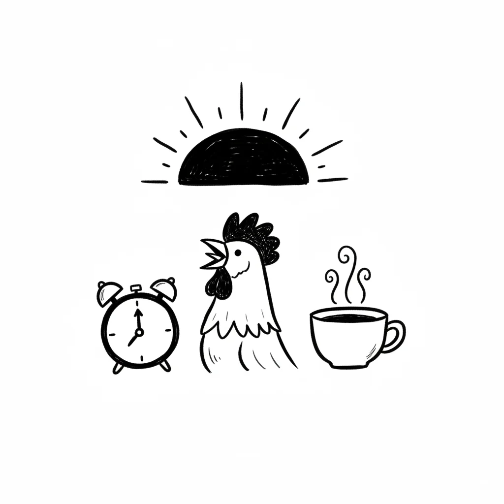 Morgenroutine-Doodle mit Sonne, Wecker, Hahn und Kaffee.