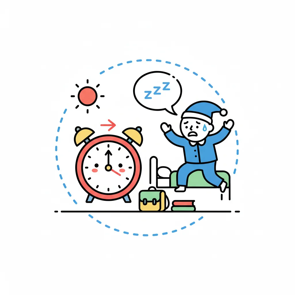 Verschlafener Charakter wacht panisch auf, der Wecker zeigt 7 Uhr. Morgenstress.
