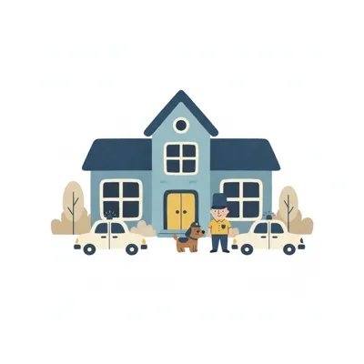 Niedliche Illustration: Polizist mit Hund vor Polizeistation und Streifenwagen.