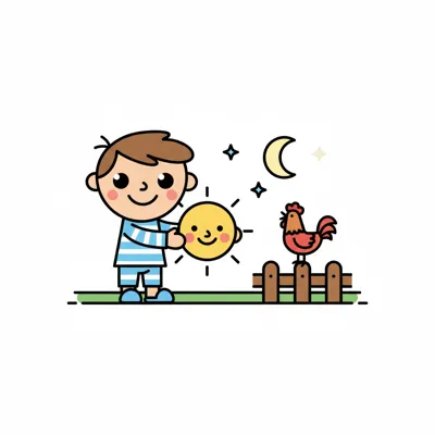 Niedlicher Junge in Pyjama weckt die Sonne, während der Hahn kräht und der Mond am Himmel steht.