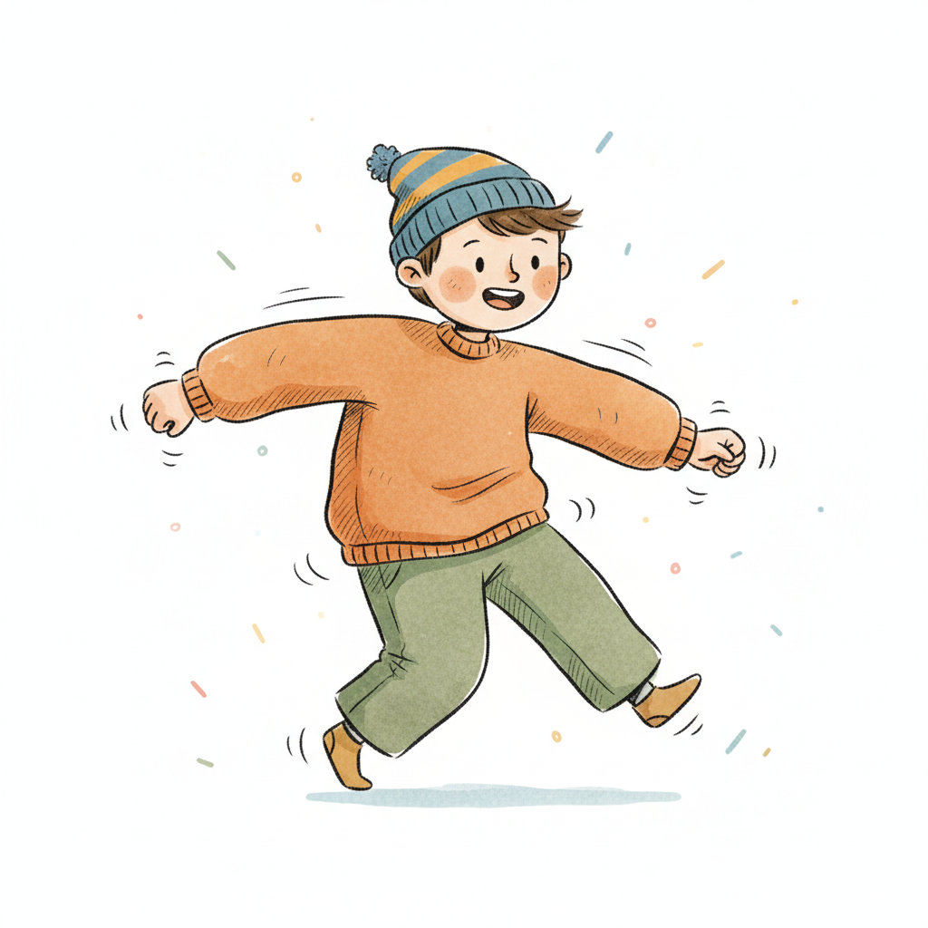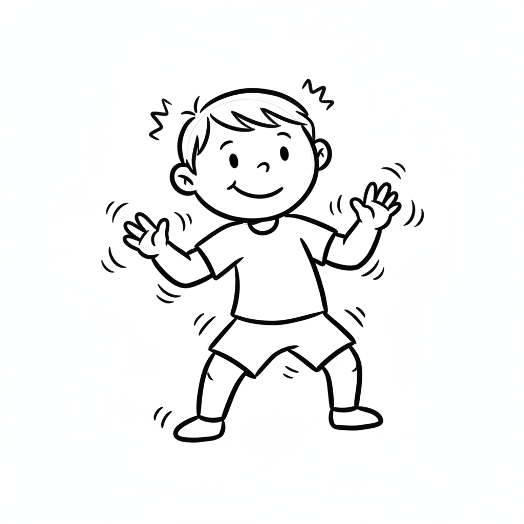 Schwarz-weiß-Cartoon eines lächelnden Jungen, der sich schüttelt oder tanzt, mit Bewegungslinien.