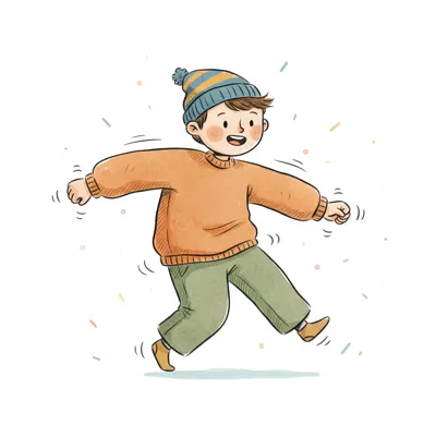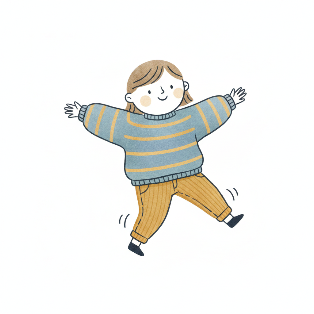 Illustration eines fröhlichen Kindes in gestreiftem Pullover, das mit ausgestreckten Armen und Beinen springt.