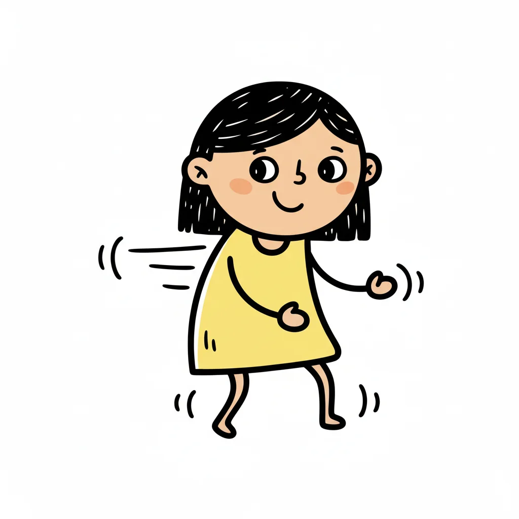Fröhliches Cartoon-Mädchen in gelbem Kleid tanzt und lächelt mit Bewegungslinien.
