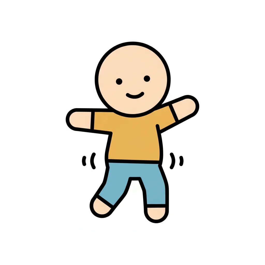 Fröhliche Cartoon-Figur in gelbem Shirt und blauer Hose, die tanzt oder springt.