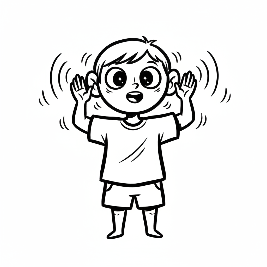 Schwarz-weißer Cartoon-Junge lauscht aufmerksam mit Händen an den Ohren und Wellenlinien.