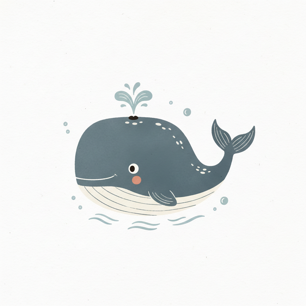 Ein stilisierter Wal schwimmt mit kleinen Fischen im Wasser.