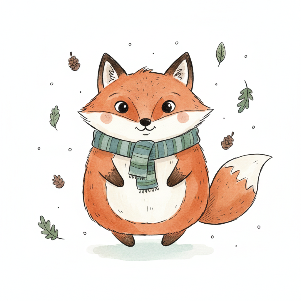 Niedlicher Fuchs mit Schal, umgeben von Herbstblättern und Tannenzapfen, im Cartoon-Stil.