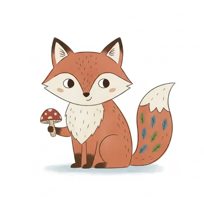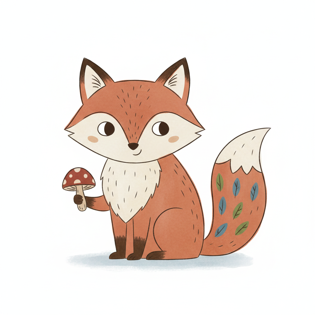 Niedlicher Cartoon-Fuchs hält einen Pilz, mit Blättermuster auf dem Schwanz.