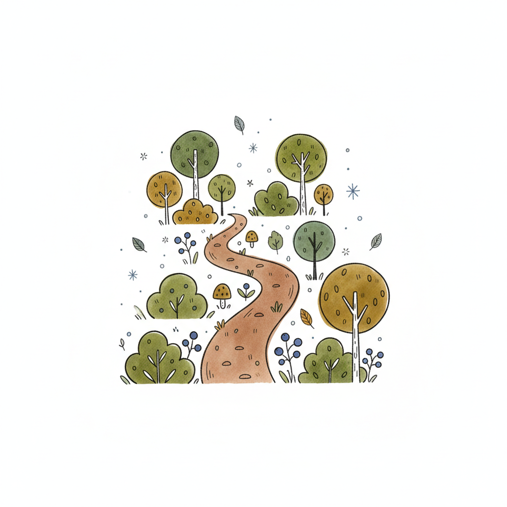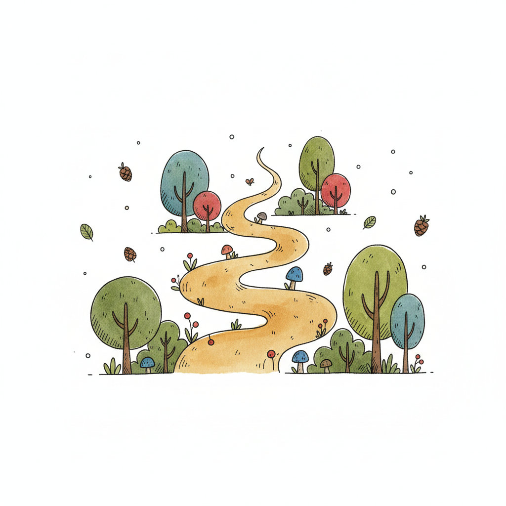Niedliche Aquarell-Illustration eines gewundenen Waldpfades mit Bäumen, Büschen und Pilzen.