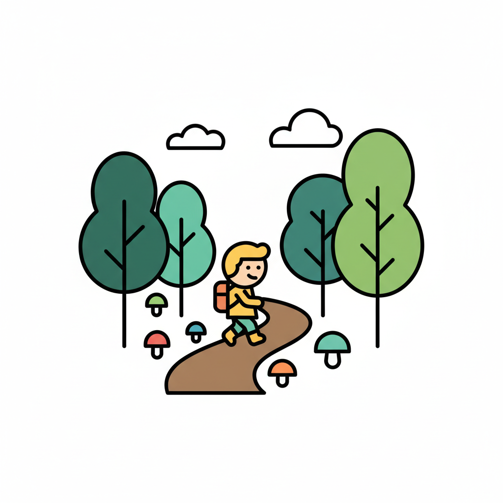Fröhlicher Wanderer mit Rucksack auf einem Waldweg, umgeben von Bäumen und Pilzen.