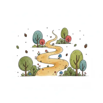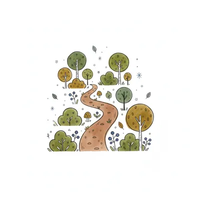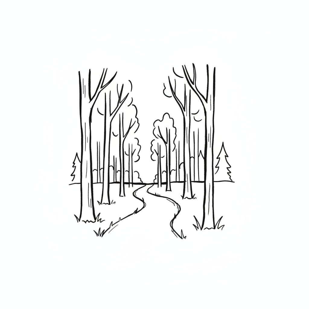 Einfache Schwarz-Weiß-Zeichnung eines Waldes mit einem gewundenen Pfad zwischen Bäumen.
