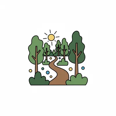 Bunter Waldweg mit Bäumen, Büschen und Sonne im Cartoon-Stil.