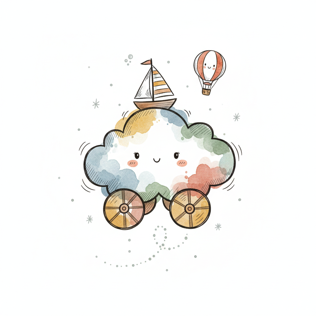 Niedliche, bunte Wolke auf Rädern mit Segelboot und Heißluftballon im Aquarellstil.