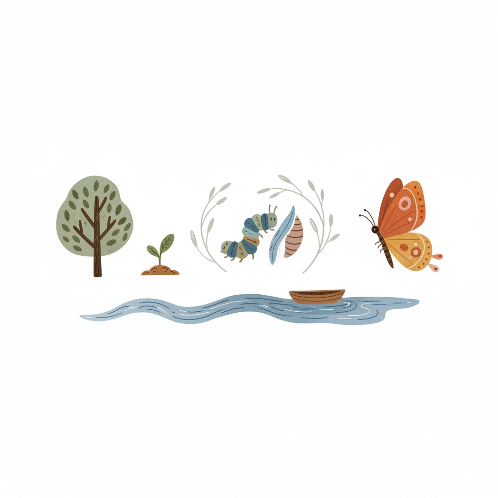 Illustration: Baum, Pflanze, Schmetterling, Raupe, Kokon, Fluss, Boot.