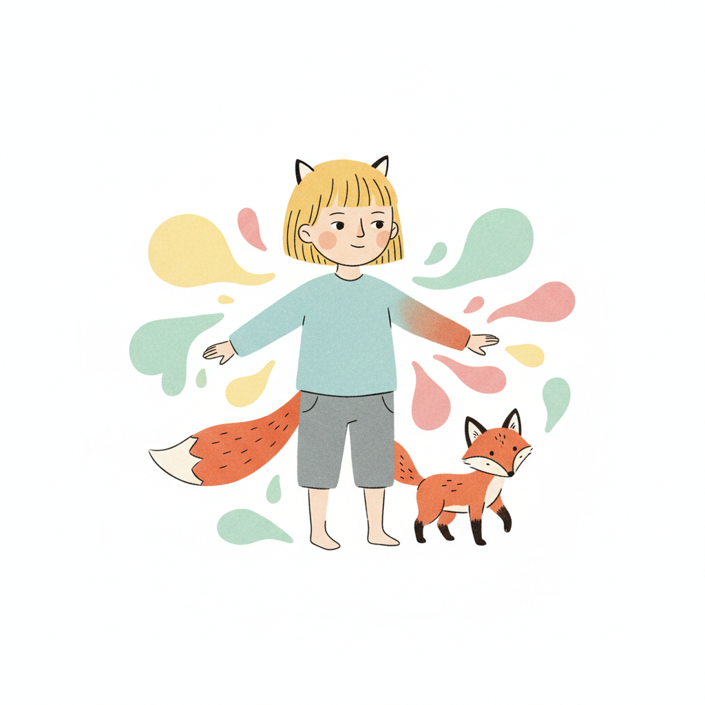 Niedliche Illustration: Kind mit Fuchsohren und -schwanz steht neben einem kleinen Fuchs, umgeben von Farbspritzern.