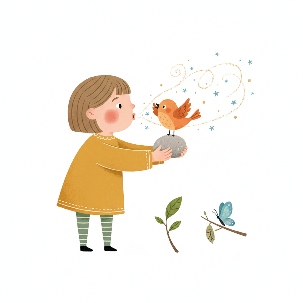 Ein Mädchen bläst einem singenden Vogel auf einem Stein zu, umgeben von Magie und Natur.