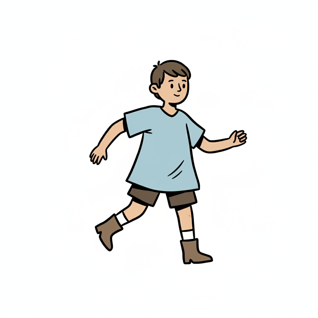Ein lächelnder Cartoon-Junge in blauem Shirt und braunen Shorts, der fröhlich läuft.