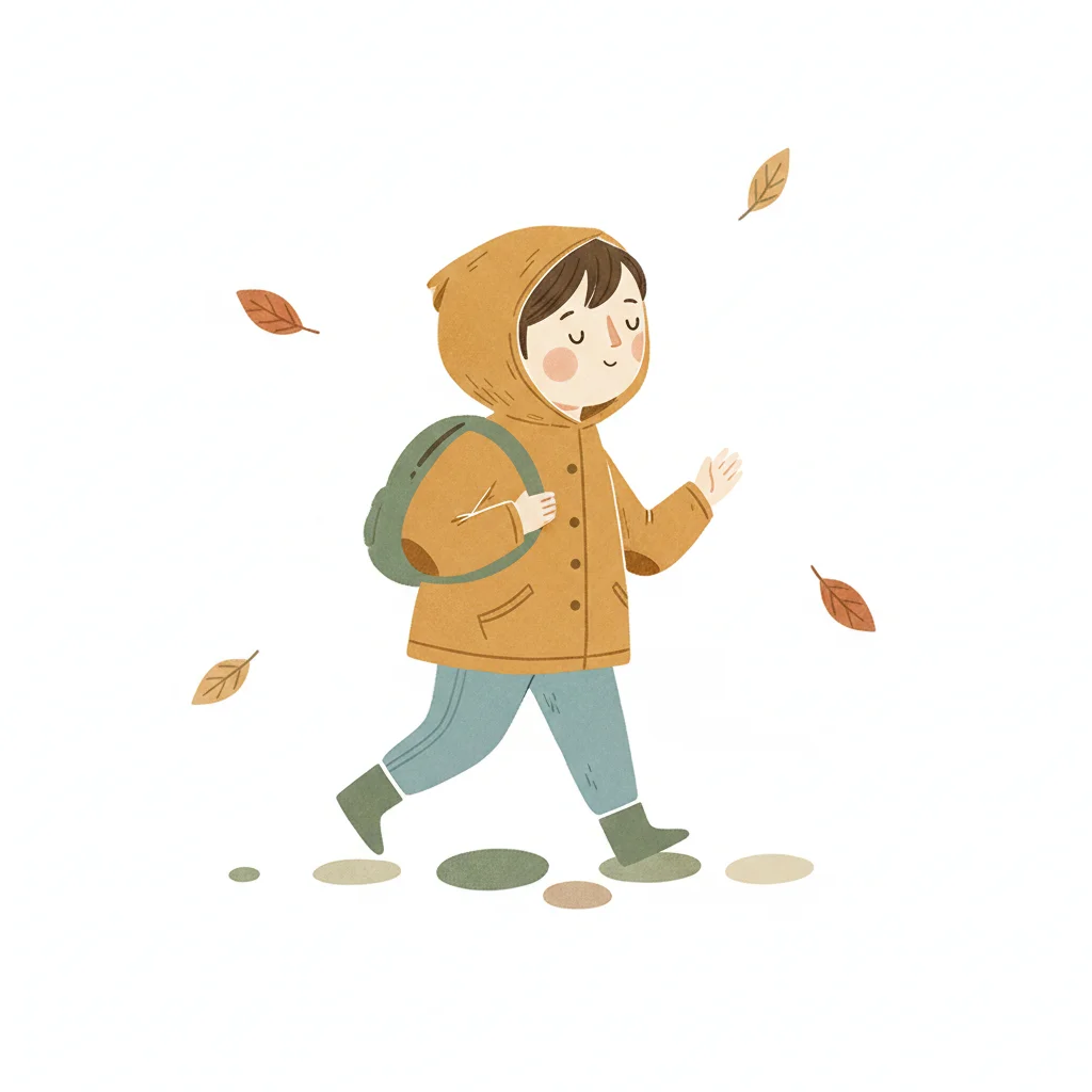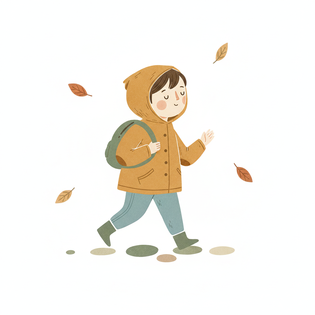 Ein Kind in Herbstkleidung mit Rucksack geht, umgeben von fallenden Blättern.