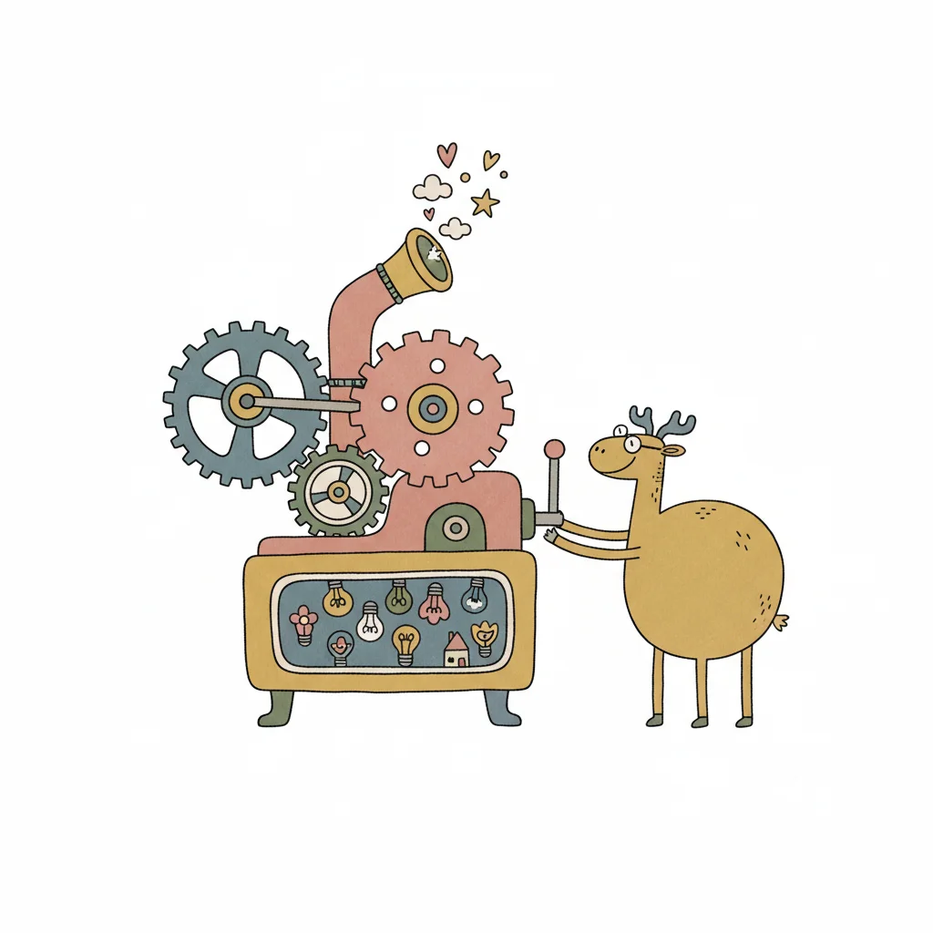 Ein Hirsch bedient eine fantasievolle Maschine, die Ideen in Herzen und Sterne verwandelt.