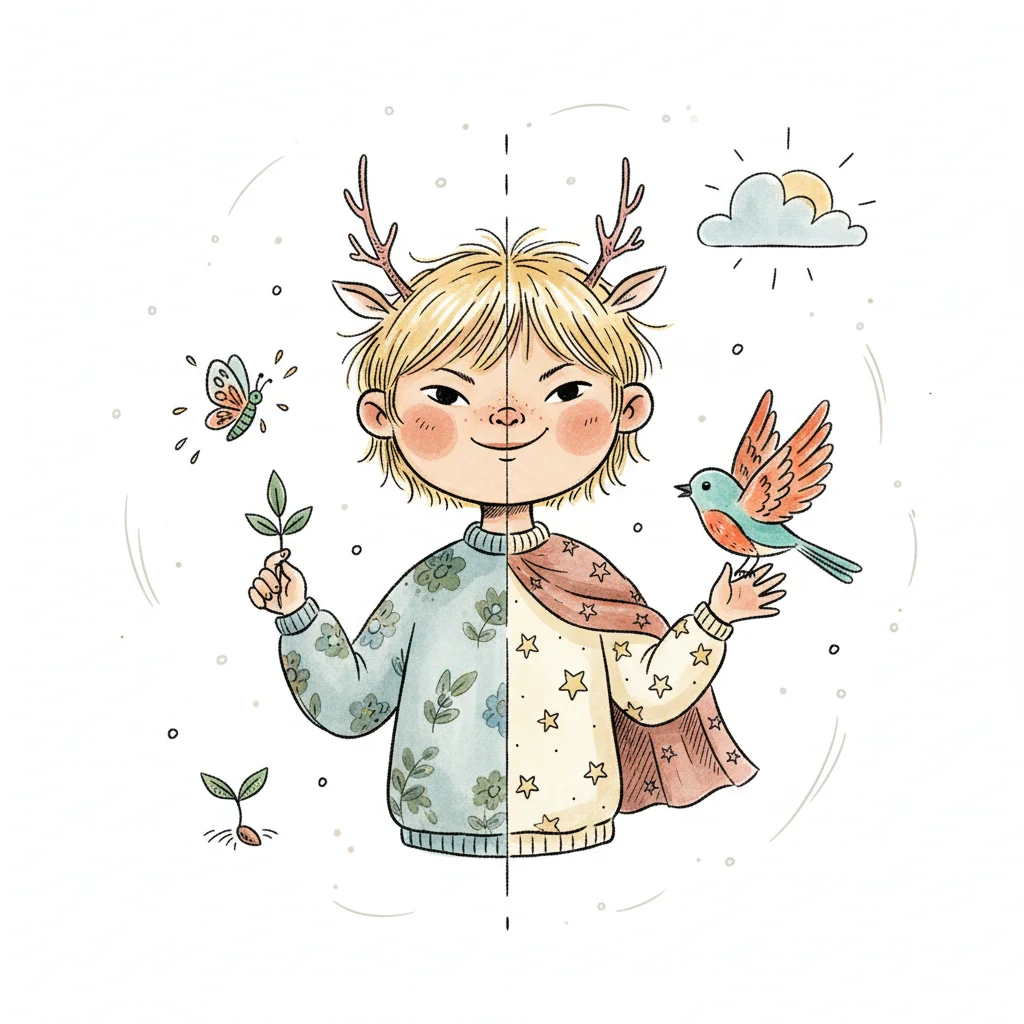 Niedliches Kind mit Geweih, geteilt in Natur- und Fantasiewelt, hält Blatt und Vogel.