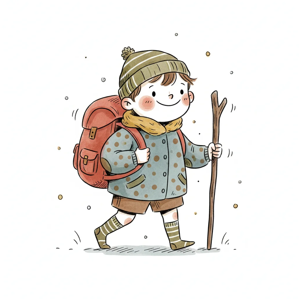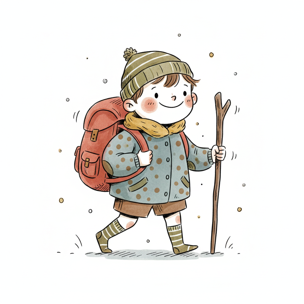 Handgezeichnete Kinderbuchillustration im modernen skandinavisch-nordischen Stil. Minimalistische, freundliche Figur mit einfachen Formen und leicht unregelmäßigen, handgezeichneten Linien. Ruhige, gedeckte Farbpalette, viel freie Fläche, reduzierte Details, sanfte Papier- oder Aquarellstruktur. Warme, ruhige, leicht humorvolle Stimmung, flächige Komposition ohne starke Perspektive, moderner nordischer Illustrationsstil, charmant und zeitlos.