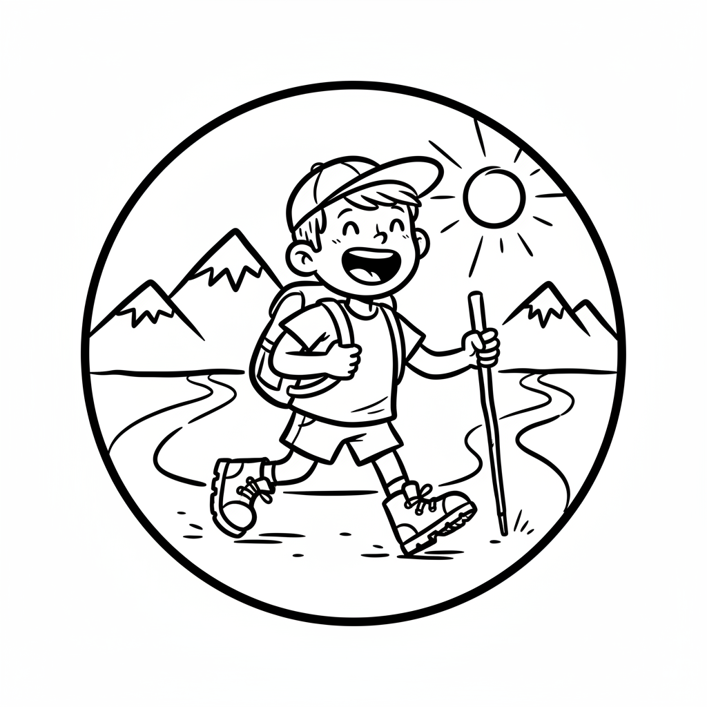 Junge wandert fröhlich in der Natur mit Berge und Sonne im Hintergrund.