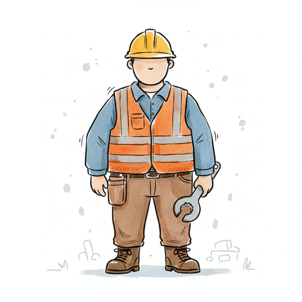 Cartoon-Bauarbeiter mit gelbem Helm, oranger Warnweste und Schraubenschlüssel.