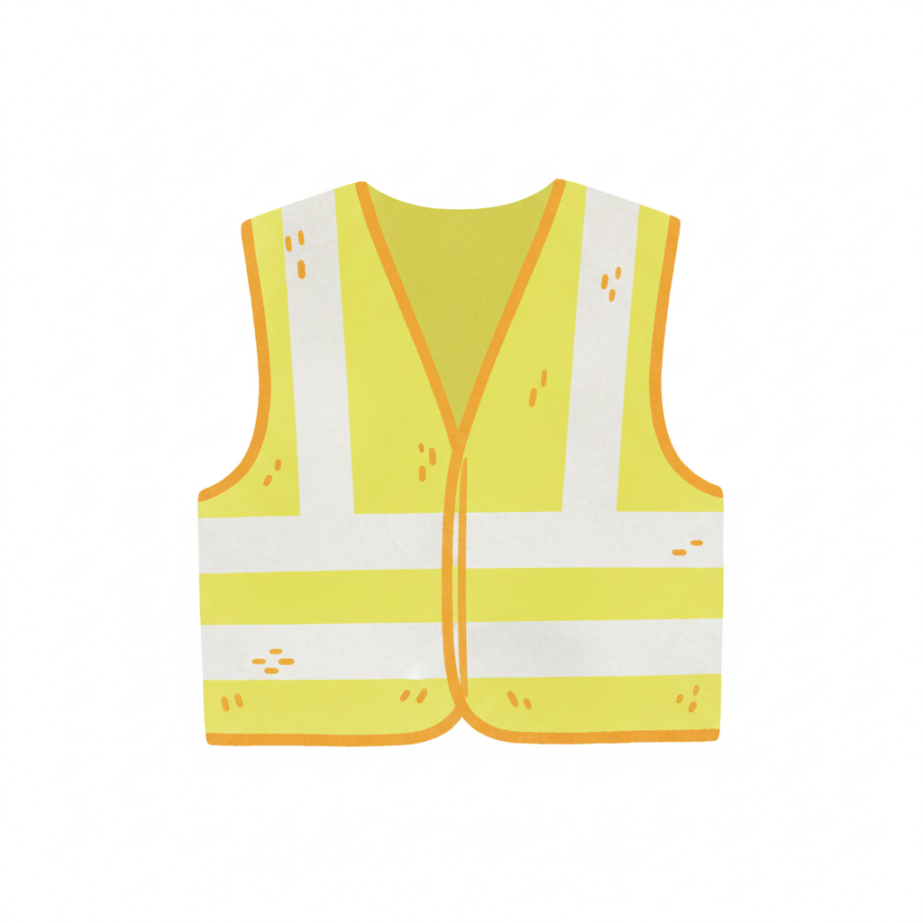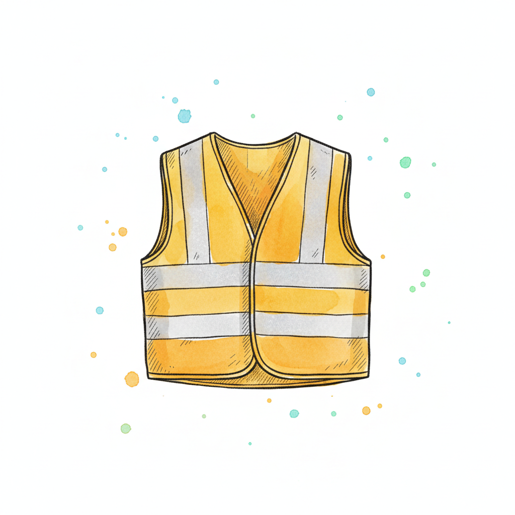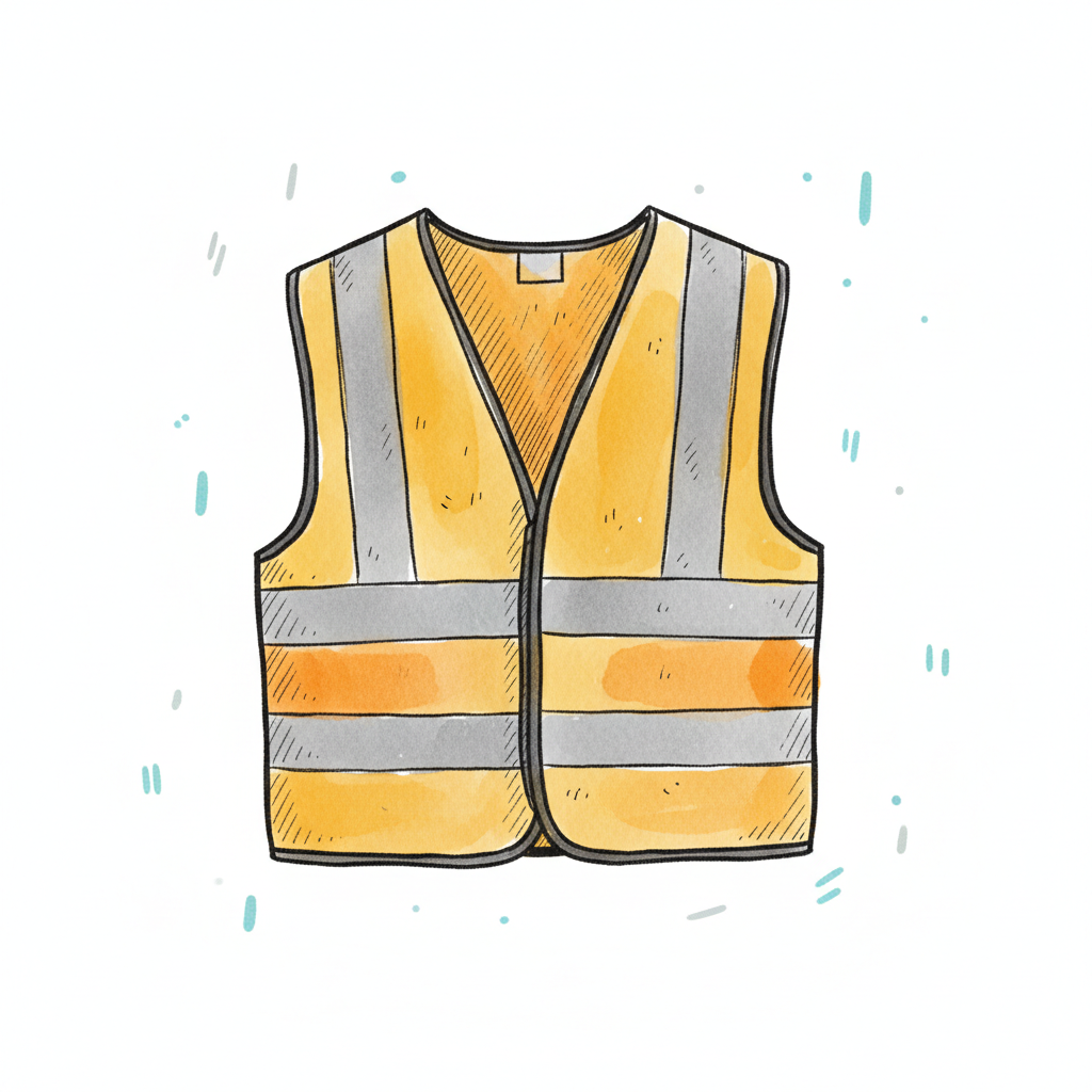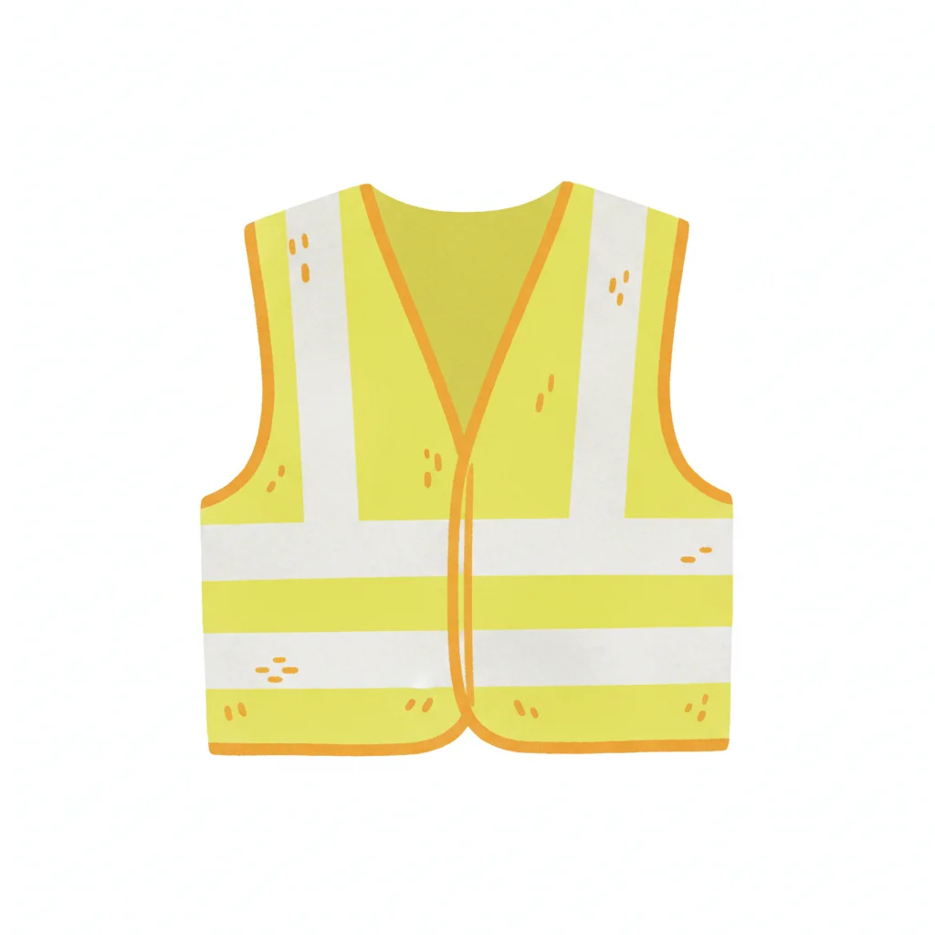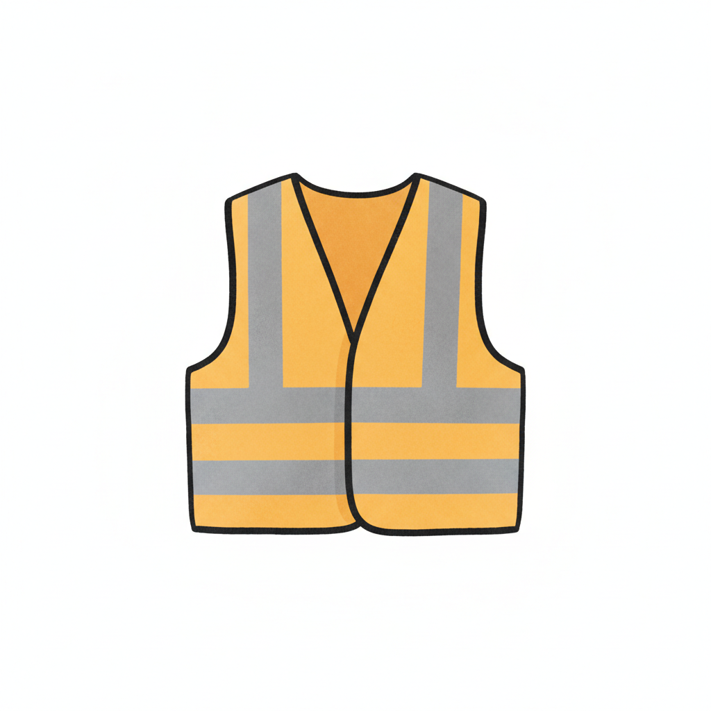 Eine gelbe Warnweste mit reflektierenden Streifen, illustriert im Cartoon-Stil.