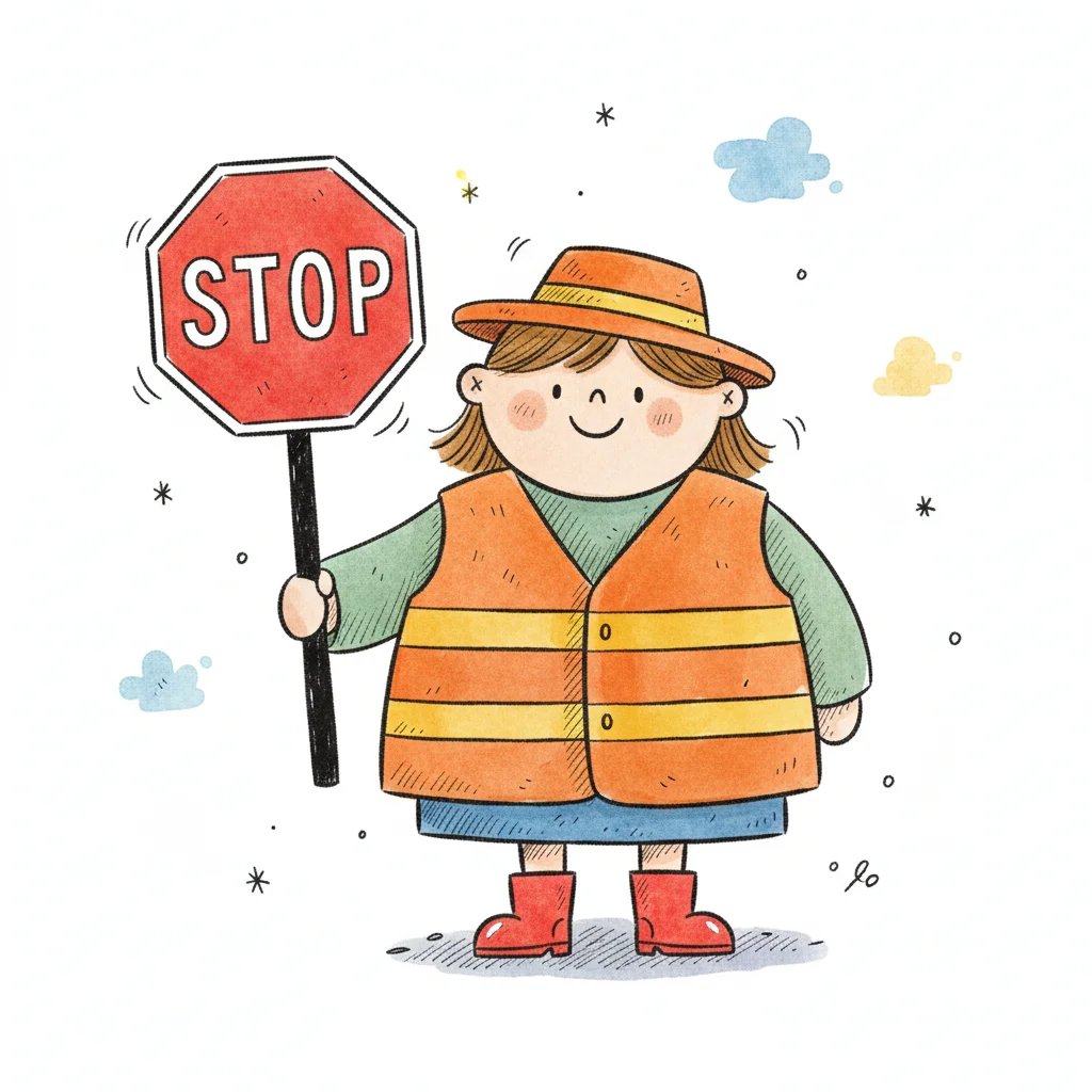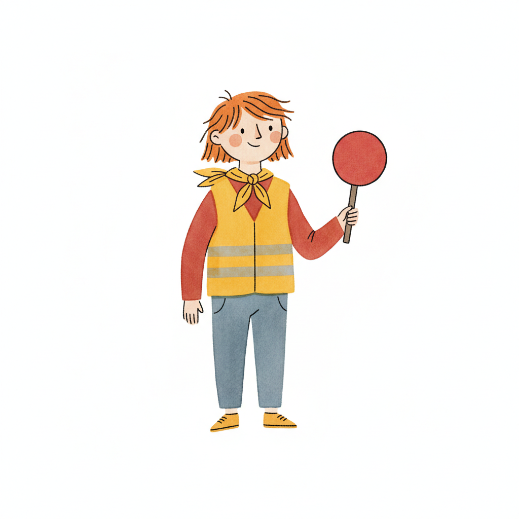 Fröhliche Figur in Warnweste und Halstuch hält ein rotes Stoppschild.