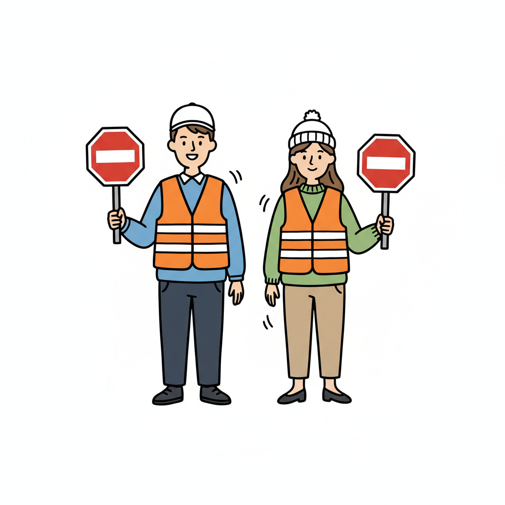 Illustration: Zwei Personen in Warnwesten halten Stoppschilder.