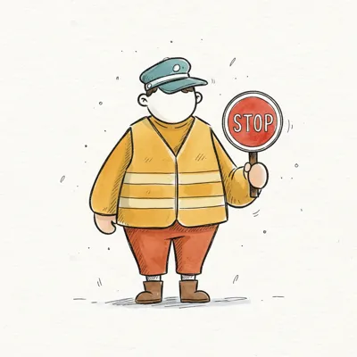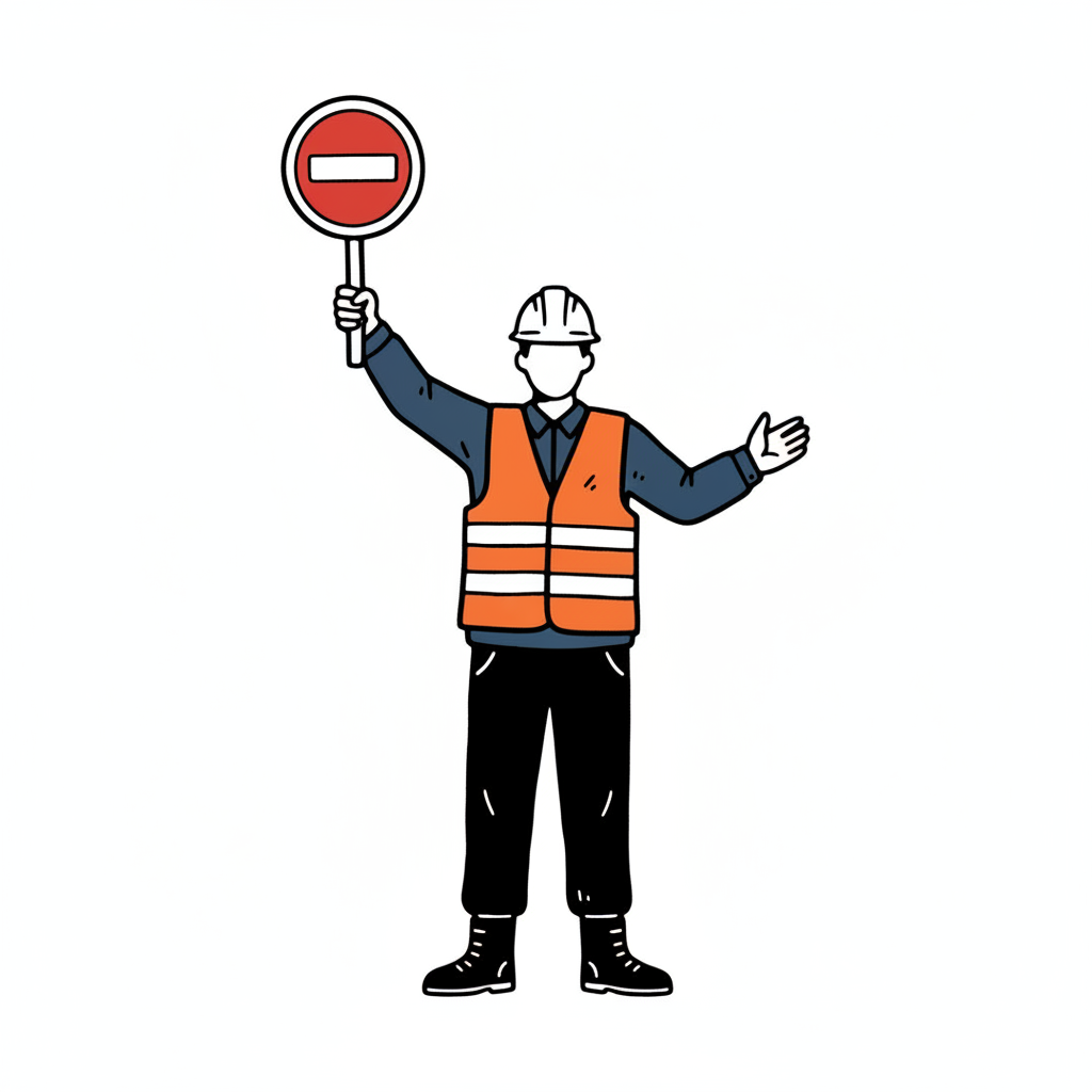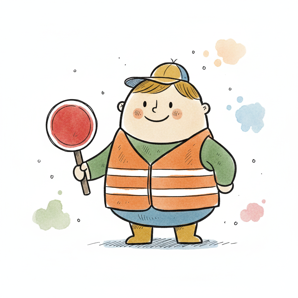 Eine gezeichnete Figur in Warnweste und Mütze hält ein rotes Stoppschild.
