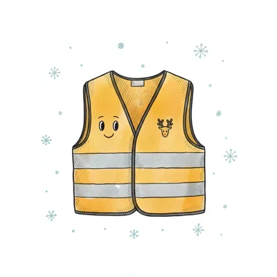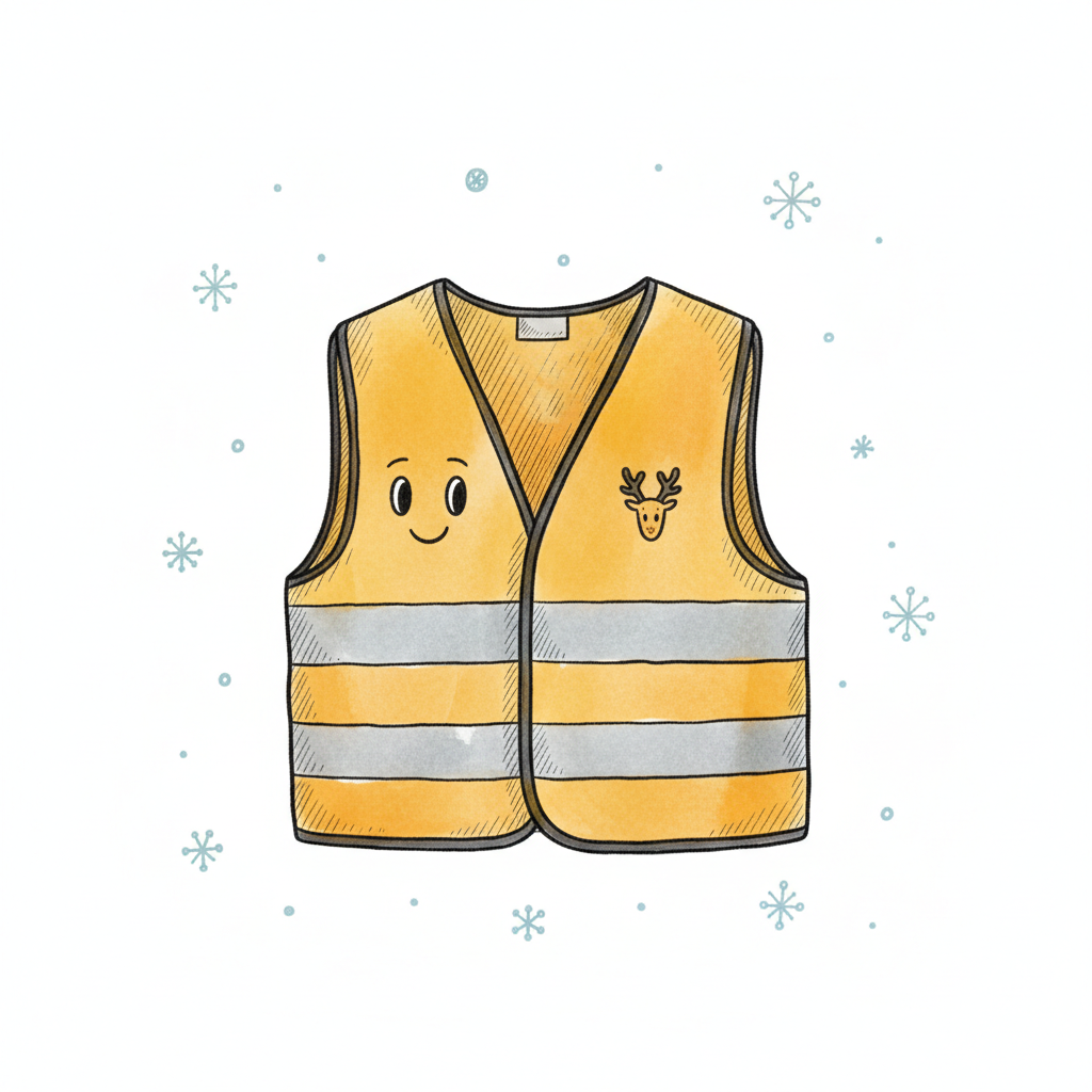 Niedliche gelbe Warnweste mit lächelndem Gesicht und Rentier-Symbol, umgeben von Schneeflocken.