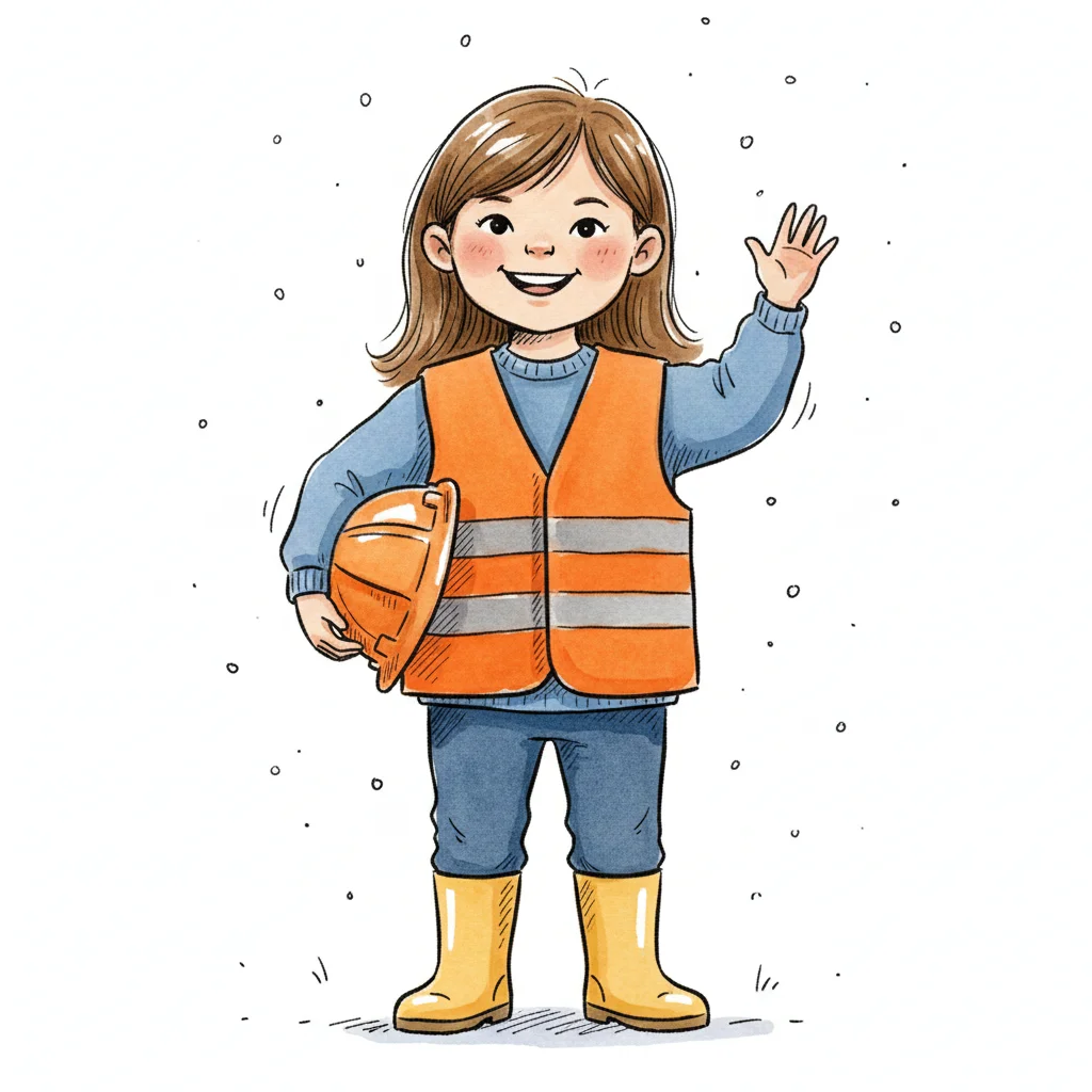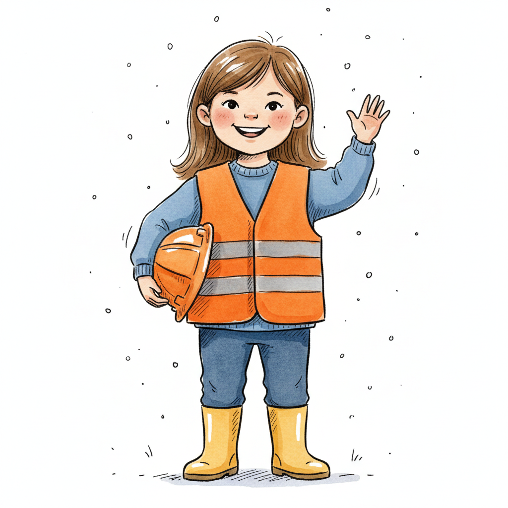 Lachendes Mädchen in Bauarbeiterkleidung mit Helm und Warnweste winkt freundlich.