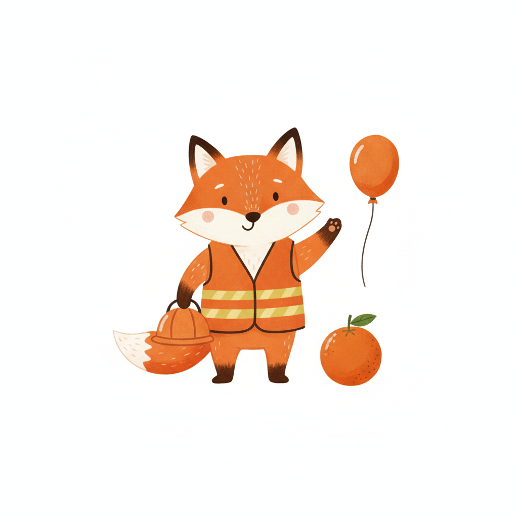 Niedlicher Fuchs in orangefarbener Warnweste mit Bauhelm, Ballon und Orange auf weißem Grund.