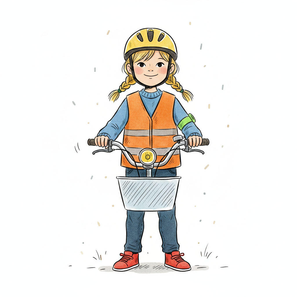 Fröhliches Mädchen mit Helm und Warnweste steht am Fahrrad, bereit zum Fahren.