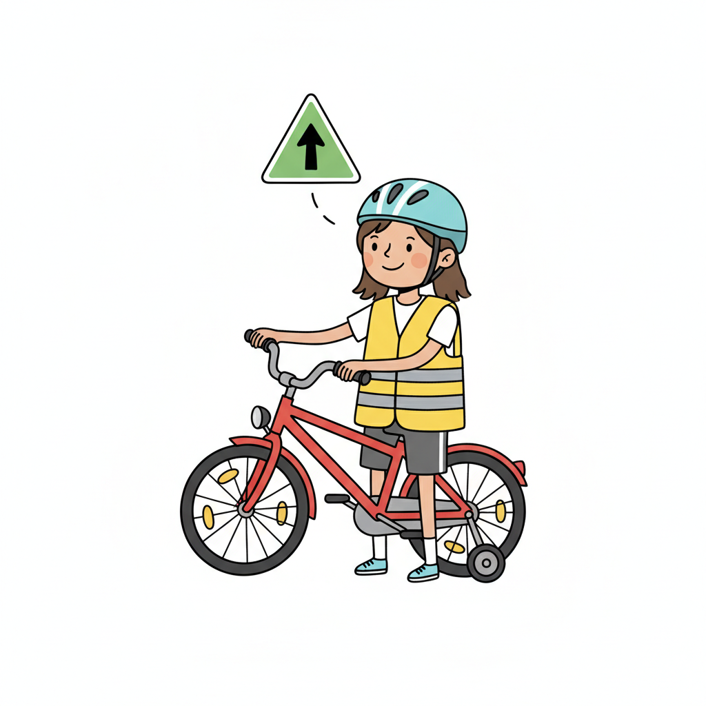 Mädchen mit Helm und Warnweste auf rotem Fahrrad mit Stützrädern, denkt an 'Geradeaus'-Schild.