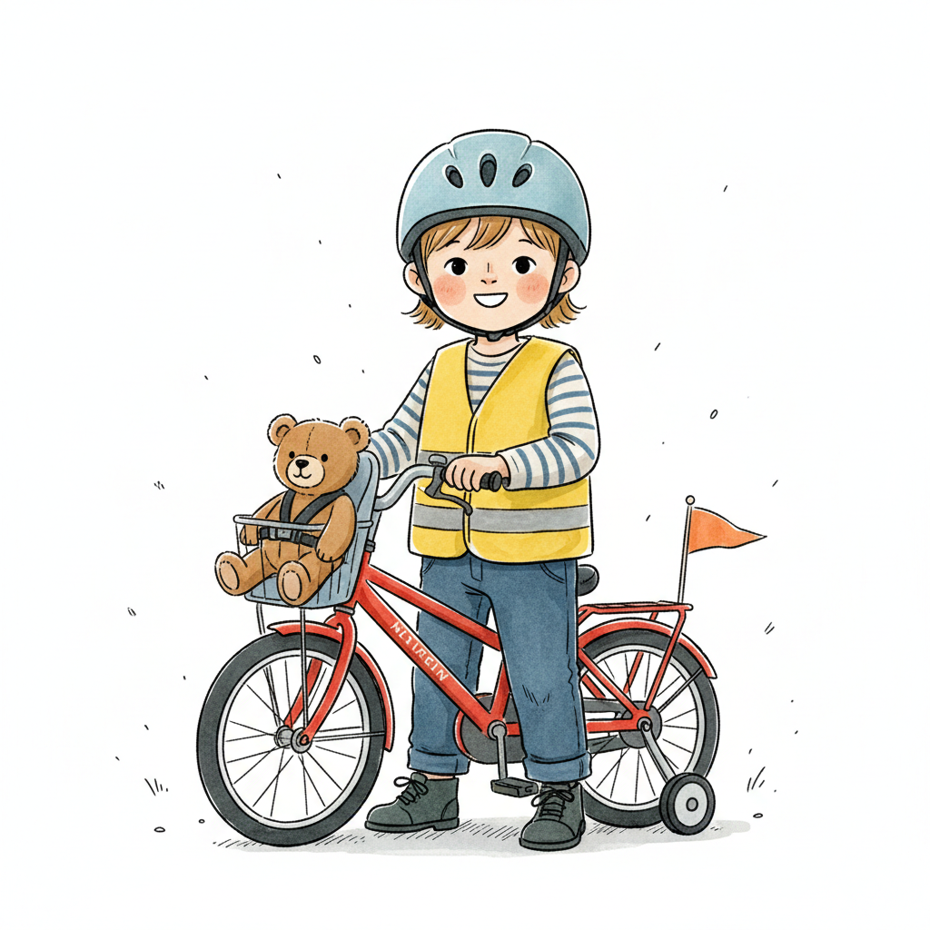 Lächelndes Kind mit Helm und Warnweste steht neben rotem Fahrrad mit Stützrädern und Teddybär.