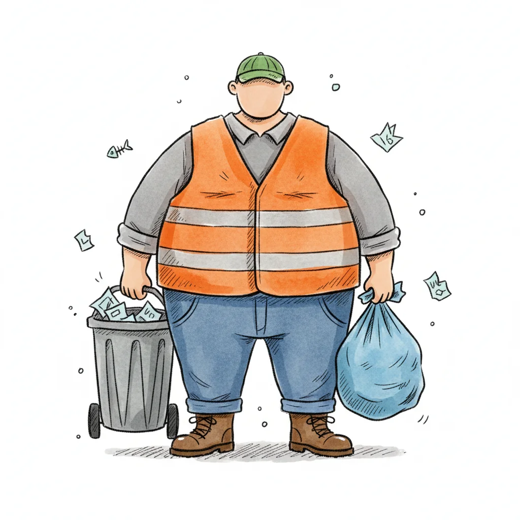 Cartoon eines übergewichtigen Müllmanns in Warnweste, der einen Mülleimer und einen Müllsack hält.