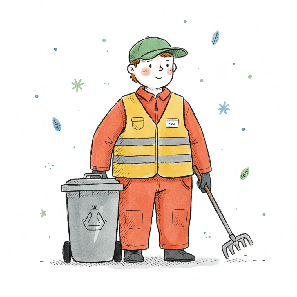 Fröhlicher Cartoon-Mitarbeiter der Stadtreinigung mit Rechen und Mülltonne in Warnweste.
