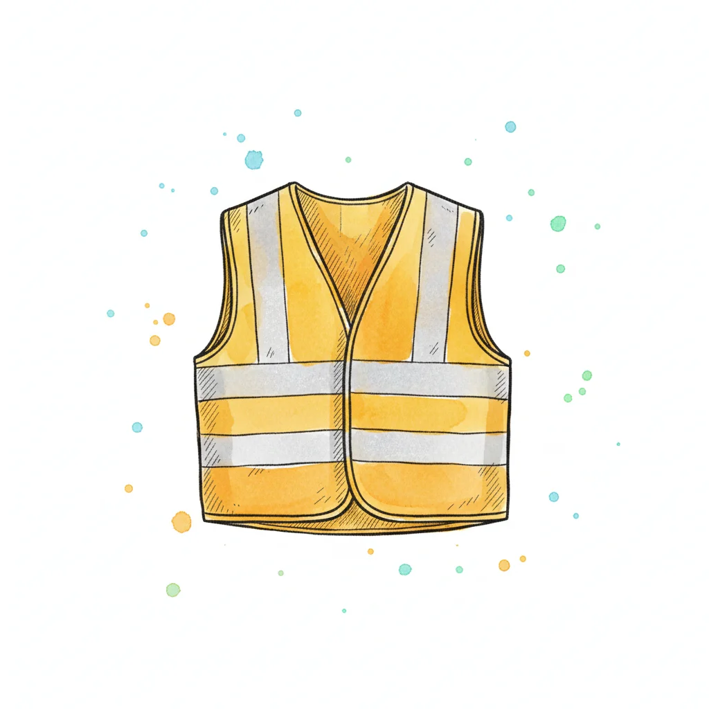 Aquarell-Illustration einer leuchtend gelben Warnweste mit silbernen Reflektorstreifen.