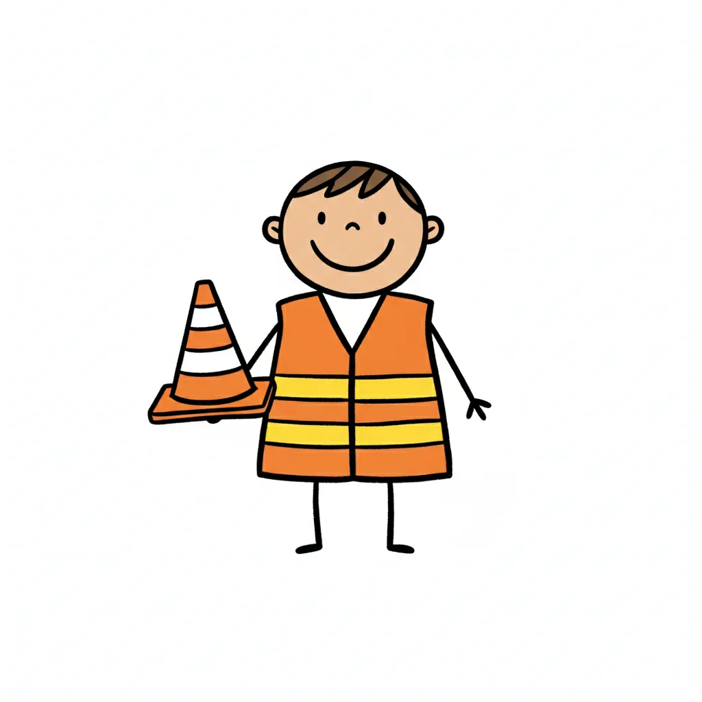 Lächelndes Strichmännchen in orangefarbener Warnweste hält einen Verkehrskegel.
