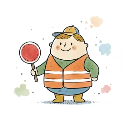 Fröhliche Cartoon-Figur in Warnweste und Kappe hält ein rotes Stoppschild. Aquarell-Stil.