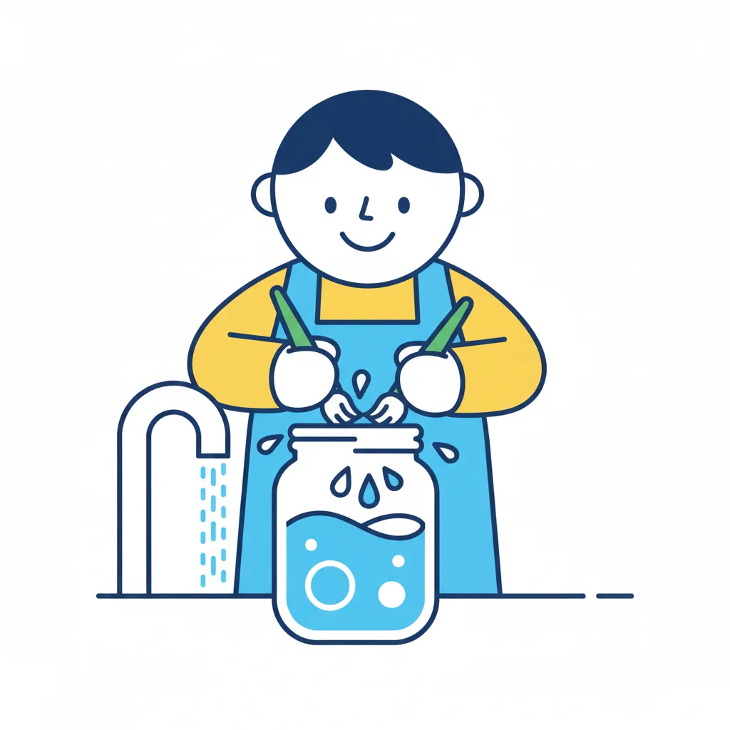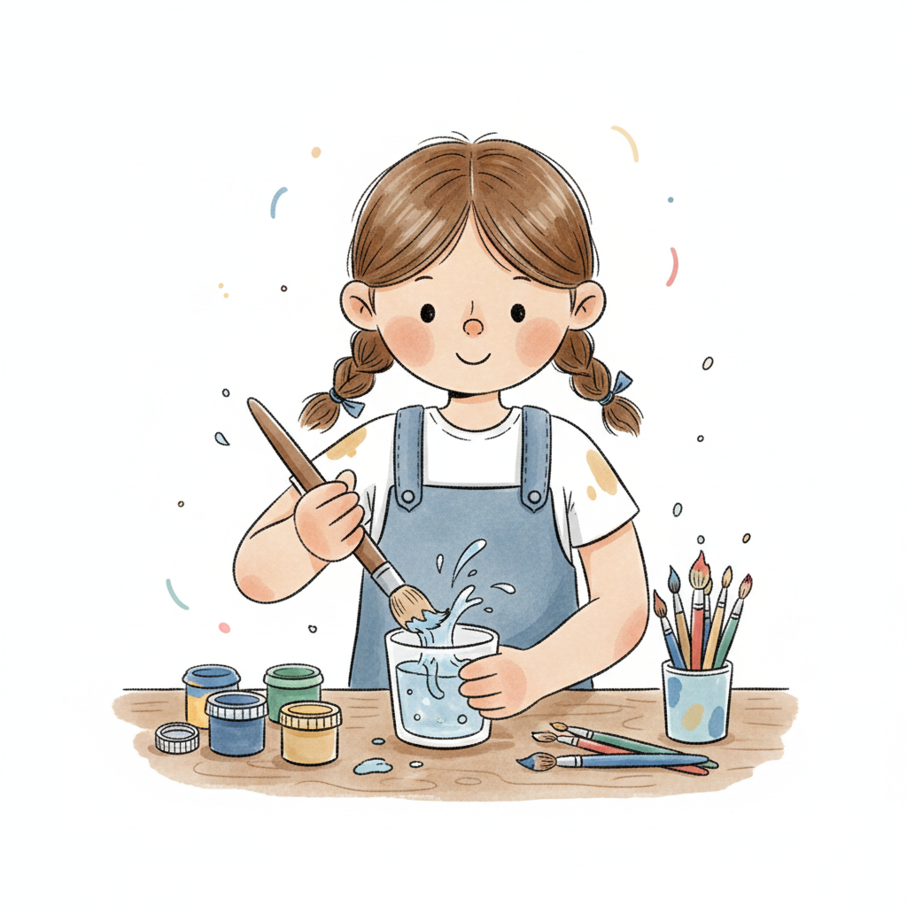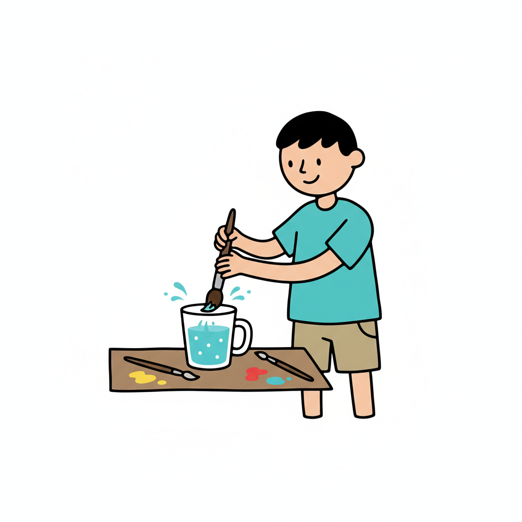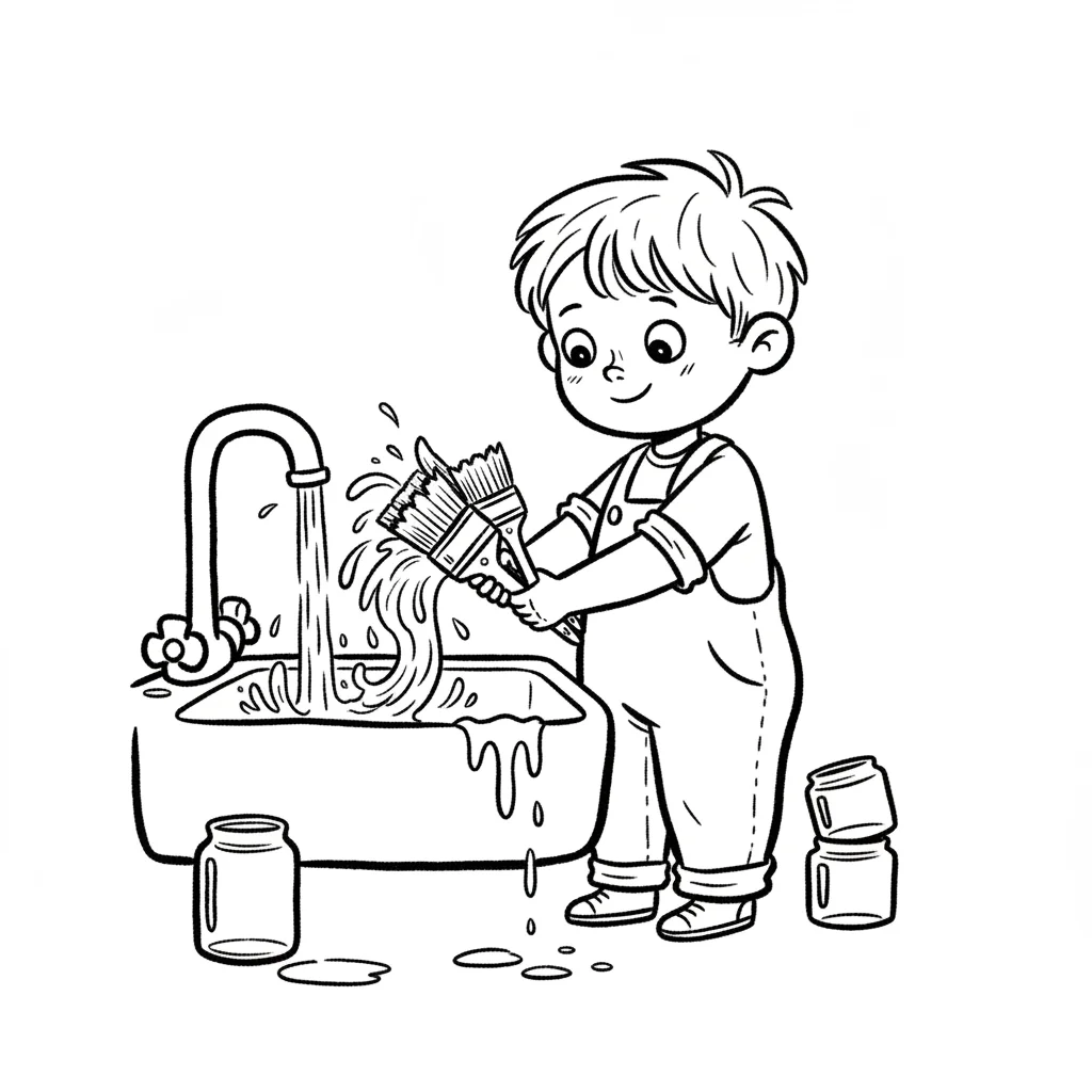 Ein Junge wäscht Pinsel in einem Waschbecken mit Wasser.