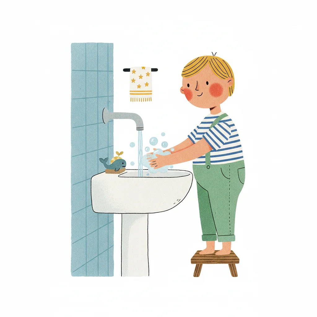 Ein Junge wäscht sich die Hände am Waschbecken.