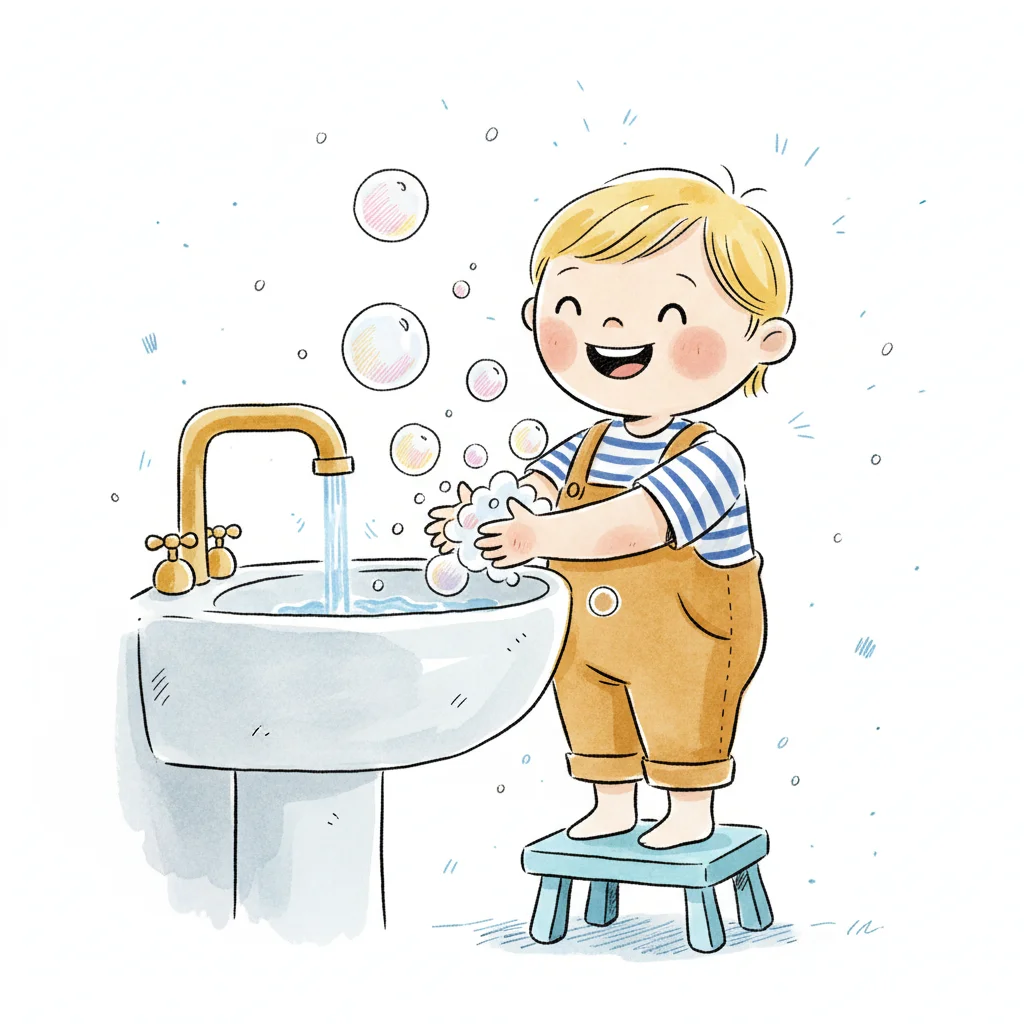 Ein fröhliches Kind wäscht sich mit Seifenblasen am Waschbecken.