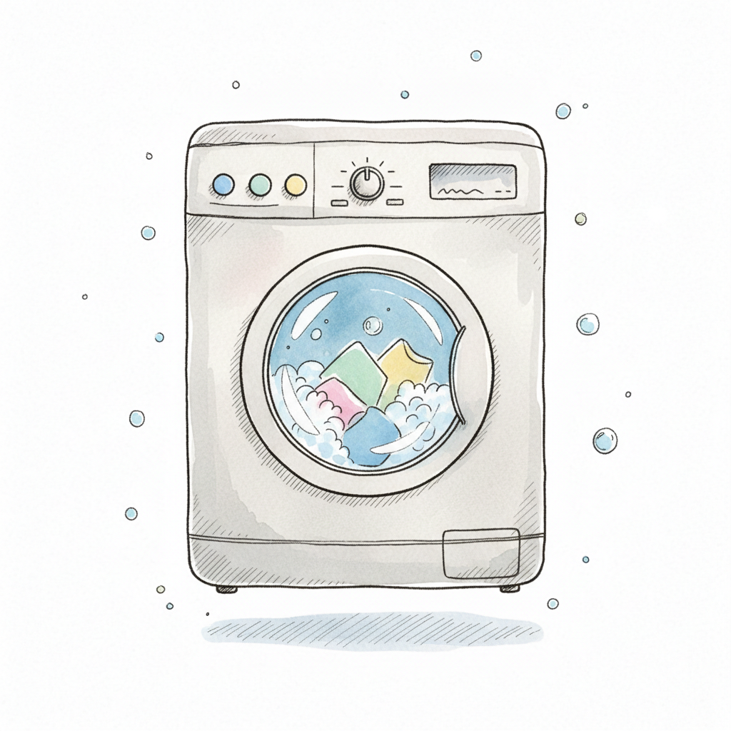 Skizze einer Waschmaschine in einfacher Linienführung.